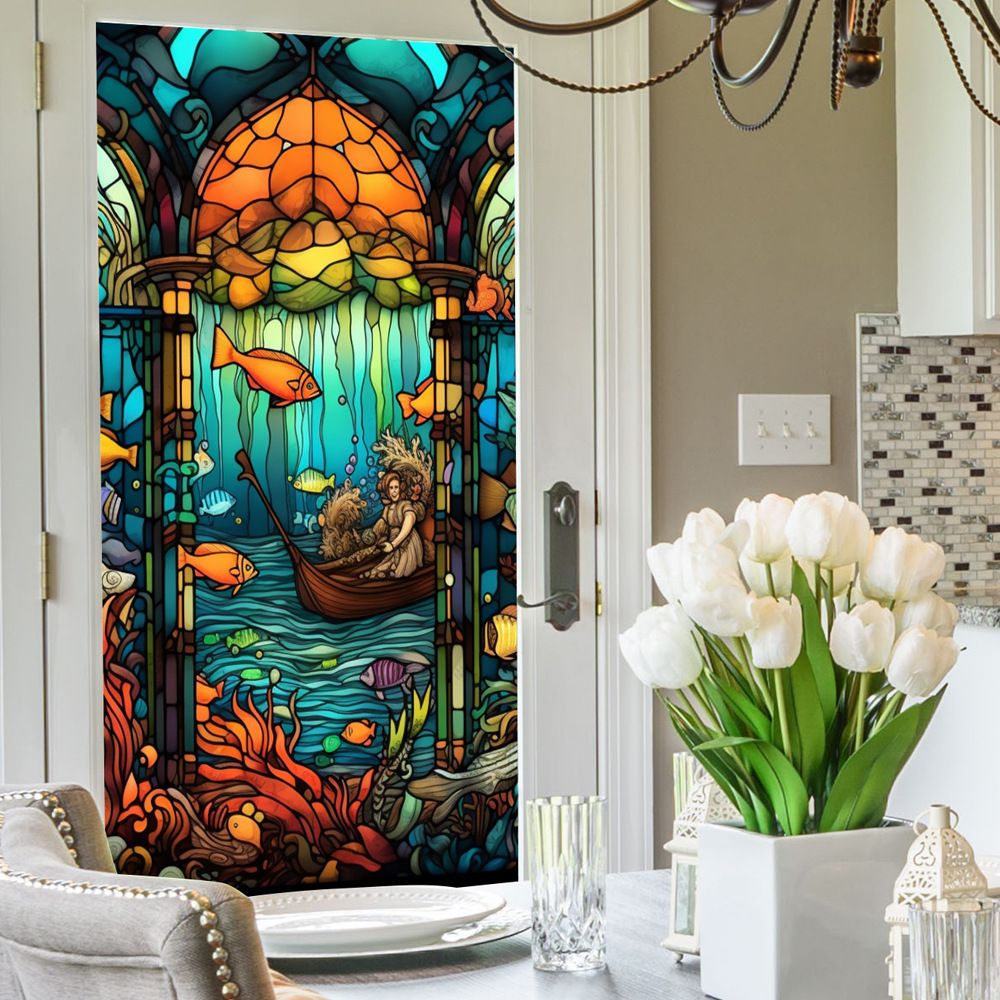 Frosted Stained Glass Window Film Removable Non-Adhesive Heat Insulation UV Blocking Colorful Pattern Static Window Clings
