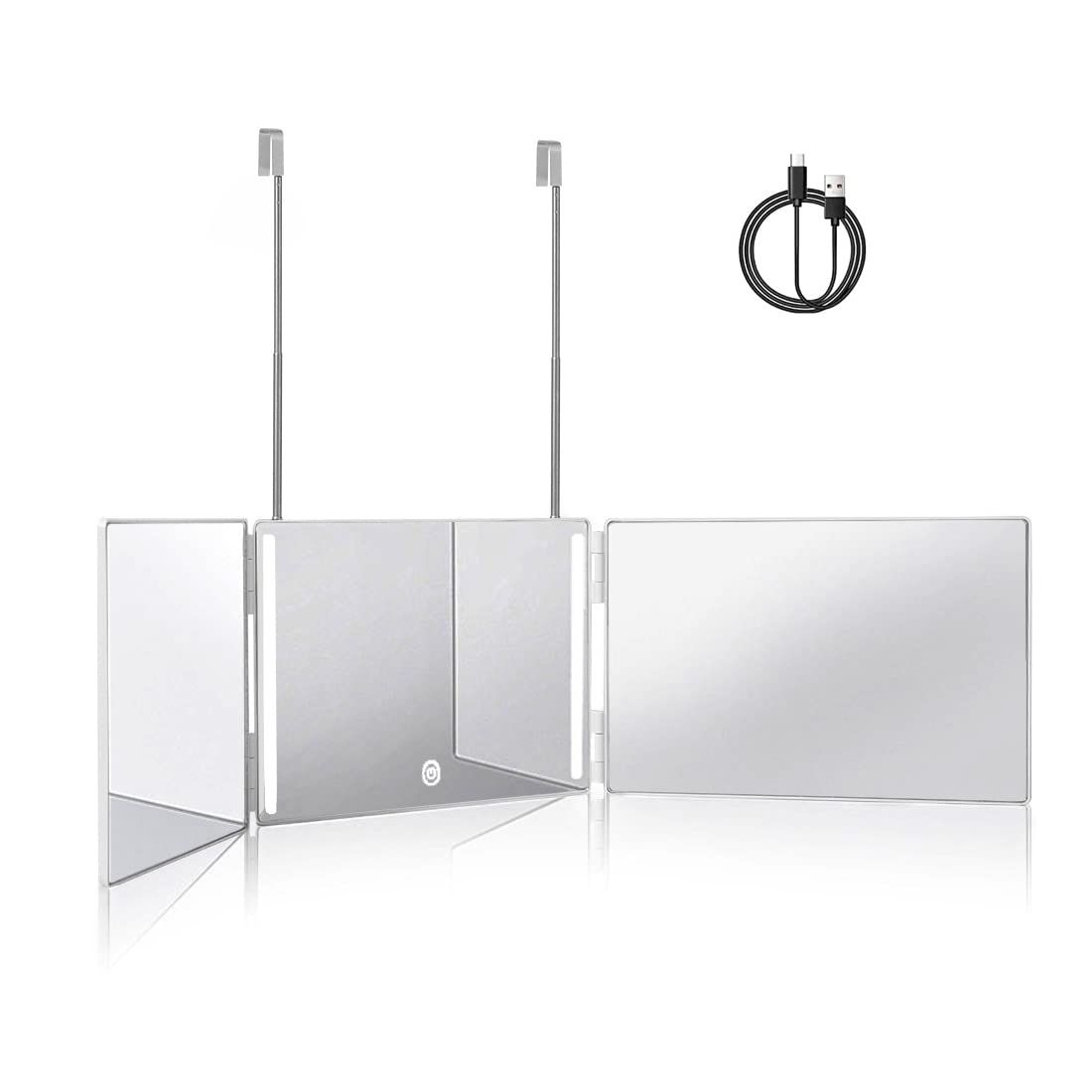 Trifold Mirror Hair Cutting 360 LED Height Adjustable Telescoping Hooks Makeup Styling White Portable